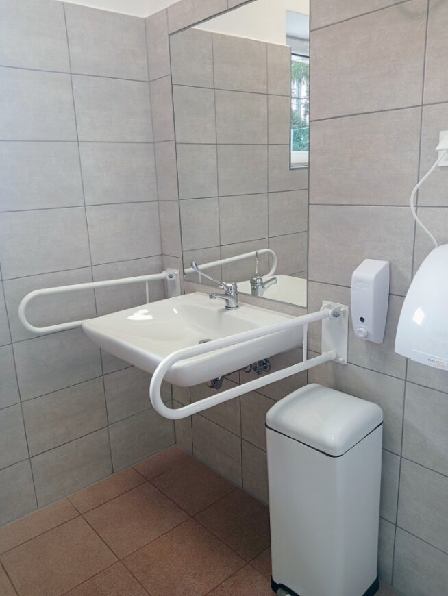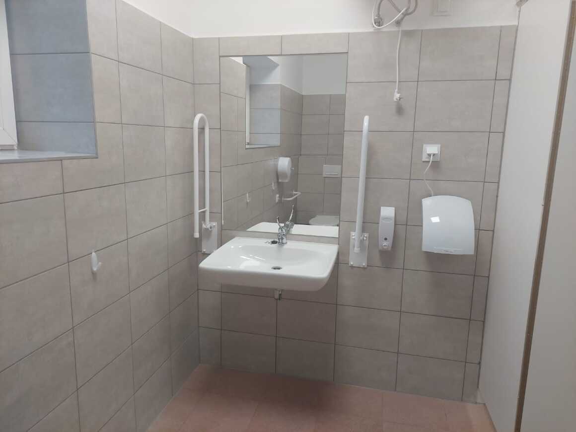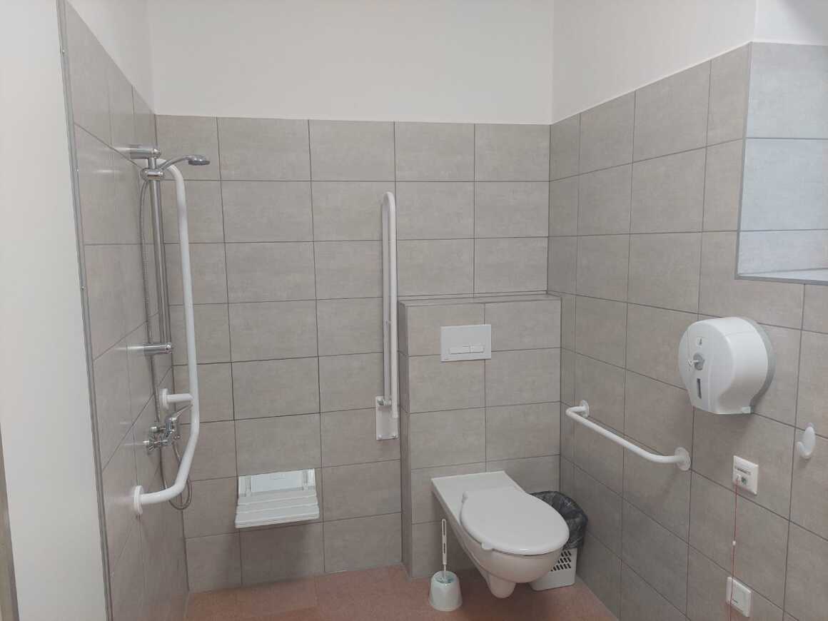 Osoby niepełnosprawne mają do dyspozycji nowoczesną, wyremontowaną łazienkę w pełni dostosowaną do ich potrzeb. Pomieszczenie charakteryzuje odpowiednia wielkość powierzchni manewrowej. Było to także kluczem do rozmieszczenia sanitariatów, ponieważ inna przestrzeń potrzebna jest dla osoby na wózku inwalidzkim, a inna dla poruszającej się z pomocą kuli oraz zadbanie o swobodę poruszania się wszystkich użytkowników. Przy projektowaniu pomieszczenia uwzględniono także wysokości płaszczyzny widzenia oraz możliwości zasięgu kończyn górnych i dolnych, a likwidacja progów zwiększyła bezpieczeństwo poruszania się osób na wózkach. Konieczna była także odpowiednia szerokość drzwi, w które z powodzeniem zmieści się wózek. Istotna była także przestrzeń przy poszczególnych urządzeniach. Uchwyty i poręcze zróżnicowane są pod katem długości oraz średnicy.